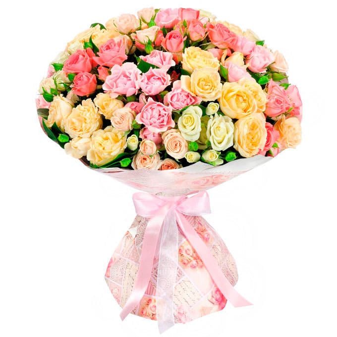 - 🌷 Кустовые розы микс (розовая, жёлтая). Упаковка (лента, плёнка, пленка матовая)